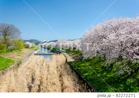 ソメイヨシノの桜の花と菜の花の春のお花見スポット 九州福岡県うきは市浮羽町巨瀬川沿い流川の桜並木