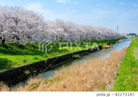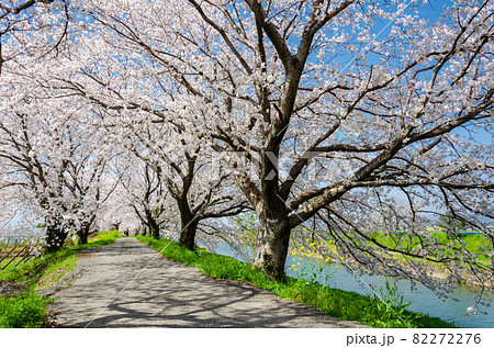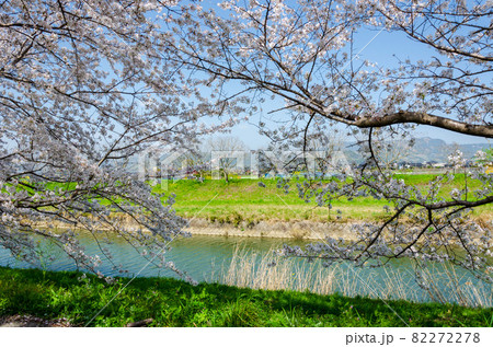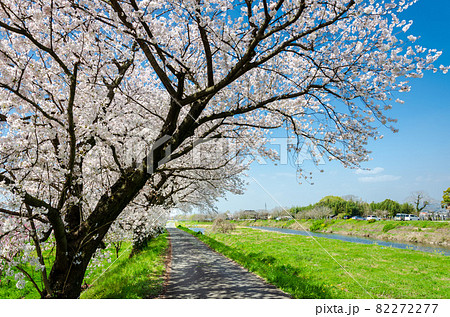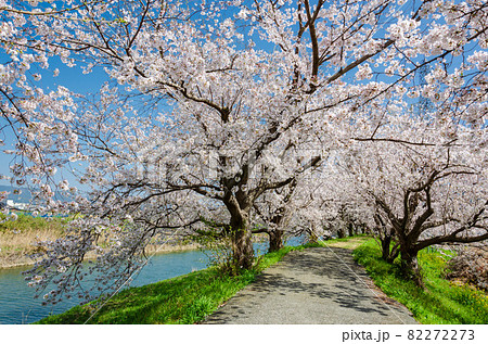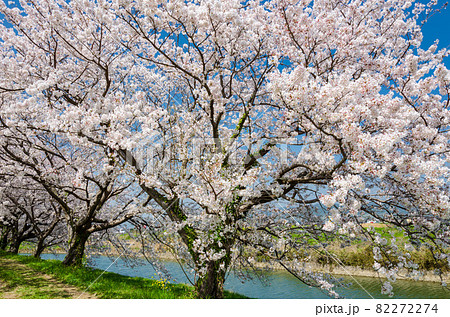満開のソメイヨシノの桜の花 春のお花見スポット 九州福岡県うきは市浮羽町巨瀬川沿い流川の桜並木