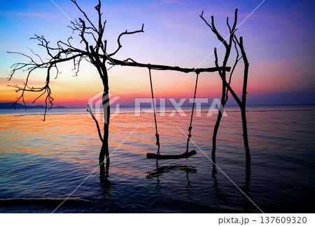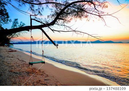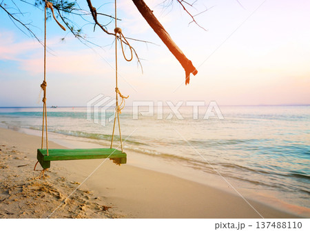 Swing on sea beach on sunset. Swing hangs on tree branch on sandy beach at tropical resort.
