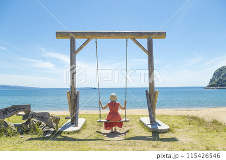 前浜海水浴場の絶景ブランコに乗る女性【長崎県南島原市】