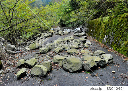 激しい雨水に土砂が流され、大石だけが林道の上に残された