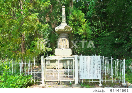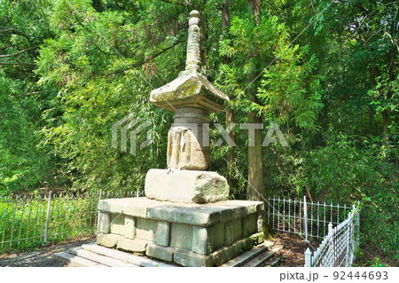 晴れた夏の日の林にたたずむ国指定重要文化財の後鳥羽上皇御影塔2 岡山県倉敷市