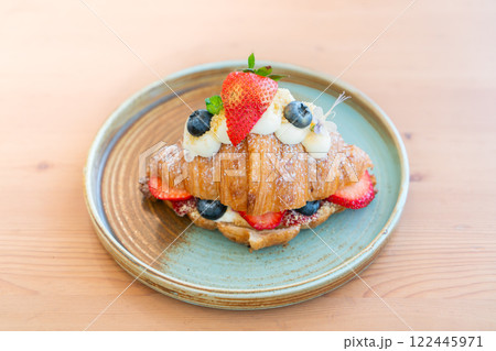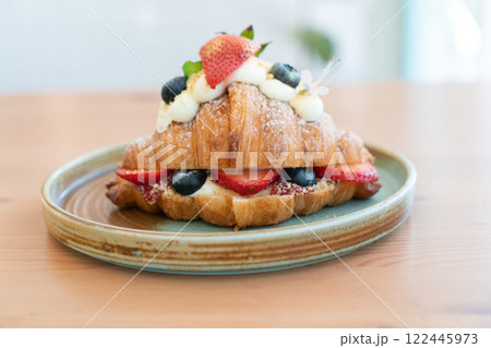 Fresh Strawberry and Blueberry Cream Croissant on a Rustic Ceramic Plate