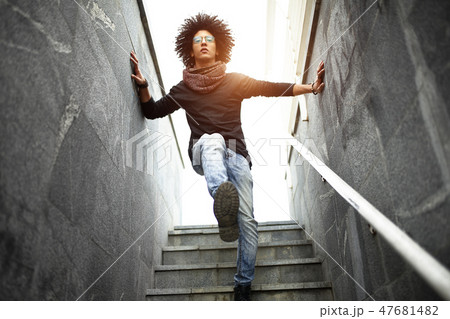 Music lover. Mulatto guy in earphones sitting on stairs browsing smartphone listening song happy