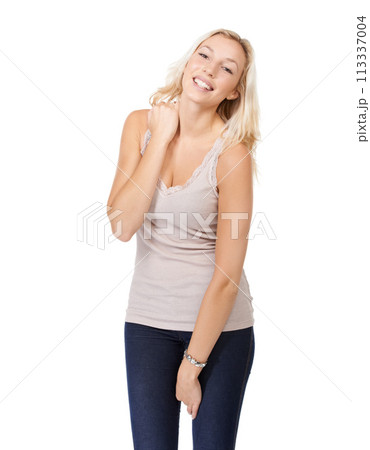 Happy, stylish and portrait of woman in studio on white background for fashion mock up in Russia. Female model, confident and hand on neck for relaxed pose in trendy, cool or casual look with clothes
