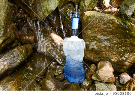アウトドアの道具 湧水を浄水器で濾過して湯沸かし