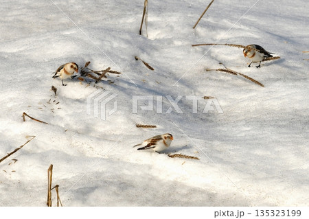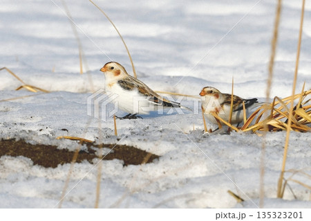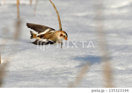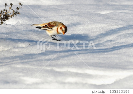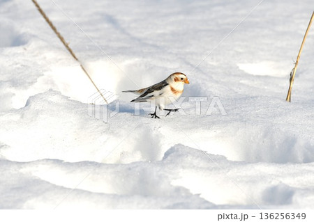 北海道 野草 小鳥 海 空 素材 海岸線の野草や草花に囲まれて野鳥が1羽【北海道北部】