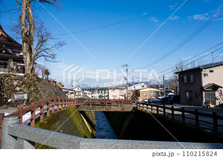 普光寺・毘沙門堂のそばの水路 浦佐駅の近く 冬晴れの青空 新潟県南魚沼市