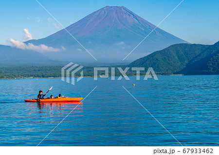 山梨県 浩庵キャンプ場から見る本栖湖越しの富士山 5月