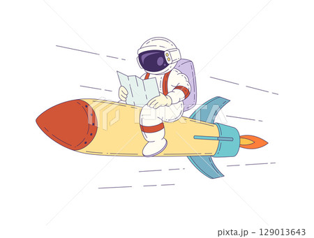 Cartoon Mascot Astronaut Sitting On Rocket Holding Map In Space Ready For Cosmic Exploration Adventure