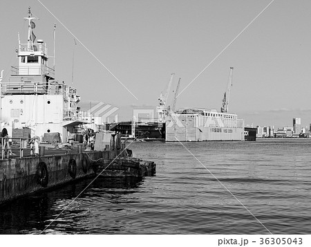 神戸 兵庫港から見る川崎重工の浮きドック(モノクロ)