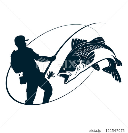 Fisherman with a fishing rod and a big fish on the line, symbol for fishing