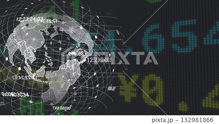 Rotating map-outlined wireframe globe on virtual screen, floating timecodes, hex codes, ¥ values