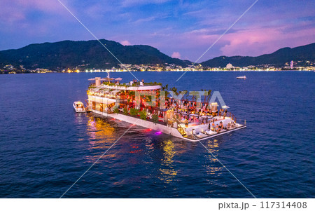 Aerial view of floating beach club in Phuket, Thailand