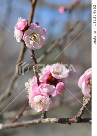 青空を背景にした濃いピンクの浮牡丹の梅の花