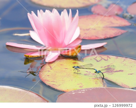 Vivid pink water lily blossoms in bright sunlight against a serene background
