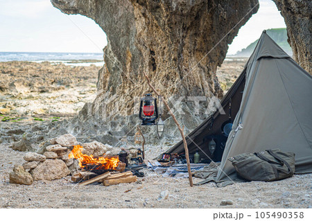 テント設営 一人キャンプ 海辺キャンプ 野営 無骨 岩場 焚き火 冒険 屋外 コピースペース
