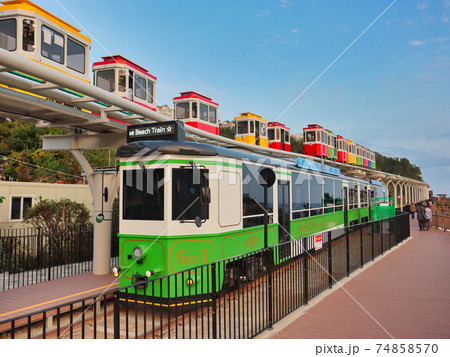 Haeundae Beach Train Running on Railway, Busan, South Korea Asia.