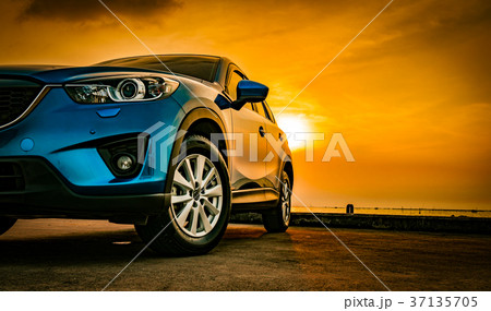 Blue SUV car with sport design parked by the sea