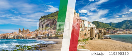 Panoramic collage with itaian flag, sandy beach and blue sea in Cefalu located on Tyrrhenian coast of Sicily, Italy.
