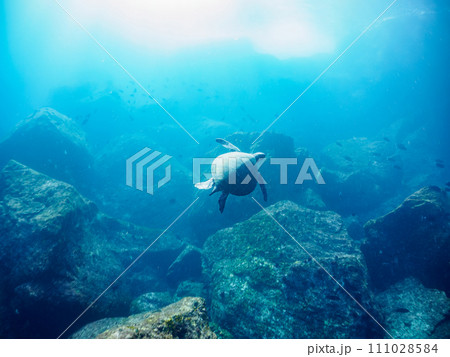 美しく大きなアオウミガメ(ウミガメ科)とサンゴの群生。 東京都伊豆諸島式根島丸根ヶ浜にて。 202