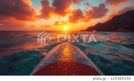 The horizon glows with vivid oranges and reds as waves crash gently against the shore, reflecting the warm colors of the setting sun on the tranquil ocean surface. Generative AI