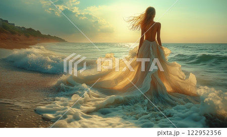 Elegant figure in flowing gown made of waves walking along tranquil beach