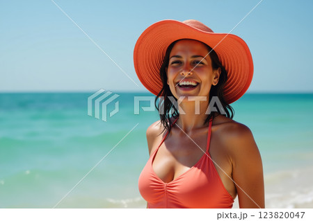 Portrait of asian woman against resort landscape background. Sea vacation background.