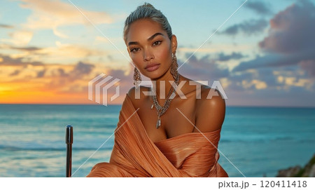 Elegant Woman Posing by the Ocean at Sunset in Stylish Fashion Outfit