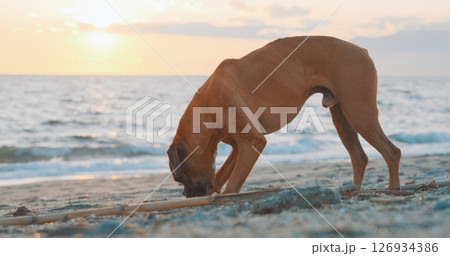 a german boxer dog sitting on the seashore. silhouette of a dog during sunset