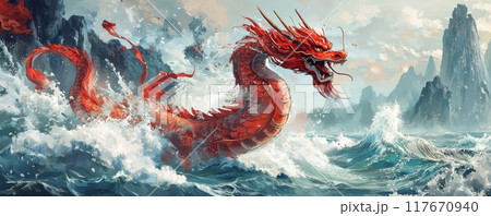 Majestic red Chinese dragon rising from turbulent ocean waves with breathtaking mountainous backdrop