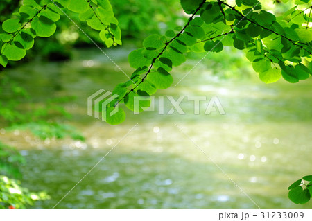 渓流の新緑と木漏れ日(フレーム、ランドスケープ版)