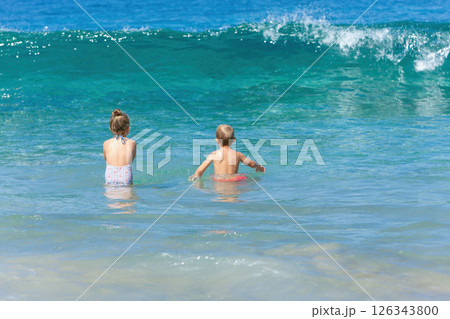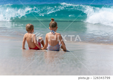 Happy kids have fun in sea surf on white sand beach. Couple of children sit in water. Travel lifestyle, swimming activities in family summer camp. Vacations on tropical island.