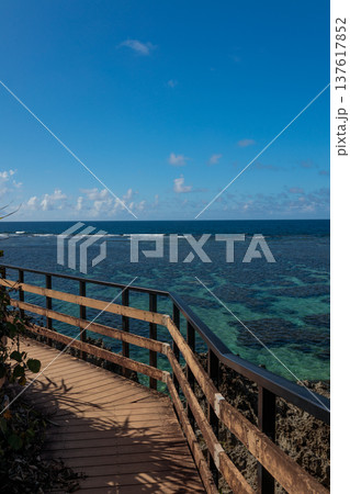サンゴ礁の海を望む木製ボードウォークの南国風景