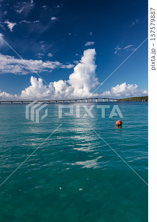 ターコイズブルーの海と橋と入道雲の南国風景