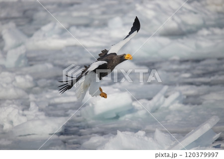 A White-tailed Sea-eagle flies over the Nemuro, Strait, Japan.