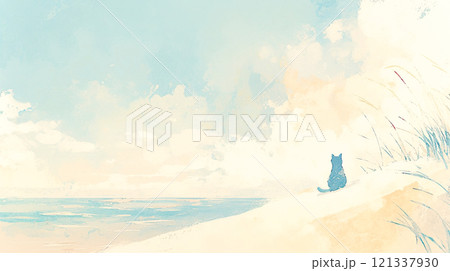 昼の砂浜で海を眺める猫の後ろ姿の水彩イラスト風景