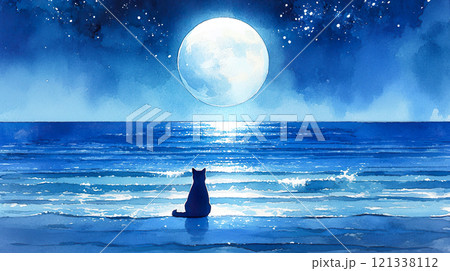 夜の海辺で美しい満月を眺める黒猫の後ろ姿の水彩イラスト風景