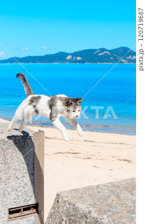 堤防をジャンプする猫(香川県仲多度郡多度津町佐柳島)