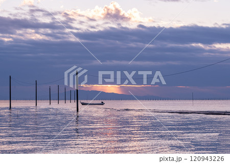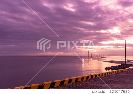 佐賀県太良町 朝の有明海の浅瀬に立つ海中鳥居横の海中道路