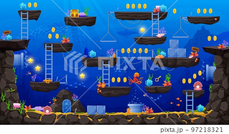 2d arcade game underwater landscape level map interface. Octopus, platform, stairs, coins and treasure icons. Computer or retro console game level vector background with seabed plants and animals