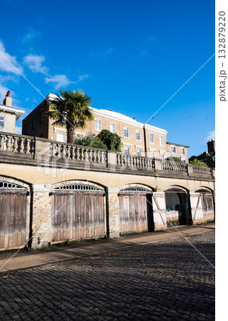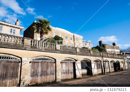 真っ青な青空と明るい日差しの下の歴史的な建物と倉庫 ロンドン郊外のリッチモンドのテームズ川沿いにて