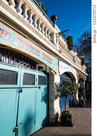 青空と明るい日差しの下のレンガ造りの建物と大きな木のドアのついた倉庫 ロンドン郊外のリッチモンドにて