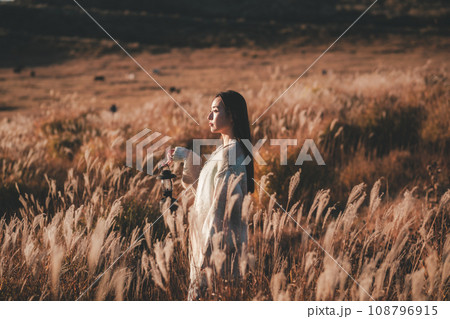 草原で仕事をする女性