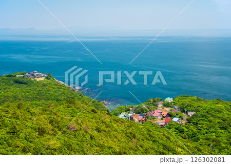 日本 三重県鳥羽市のパールロード沿いにある鳥羽展望台から見える太平洋と海女のテラス