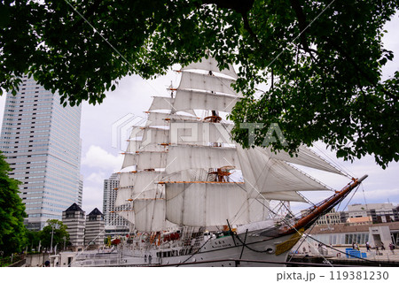 帆船と高層ビルの額縁構図