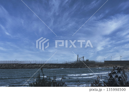 A flock of seagulls flying above the coastline near an industrial pier in Vlora, Albania, photographed on August 2025.