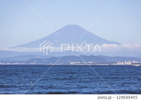 湘南、片瀬漁港西プロムナードから見た夏の富士山と海