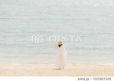 海辺で佇むシルエットの女性