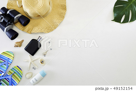 Summer holiday, travel and vacation concept. Sunglasses, starfish, beach hat, and seashell on white wooden background.